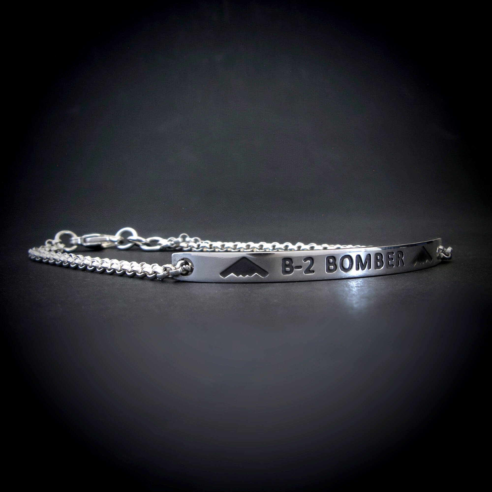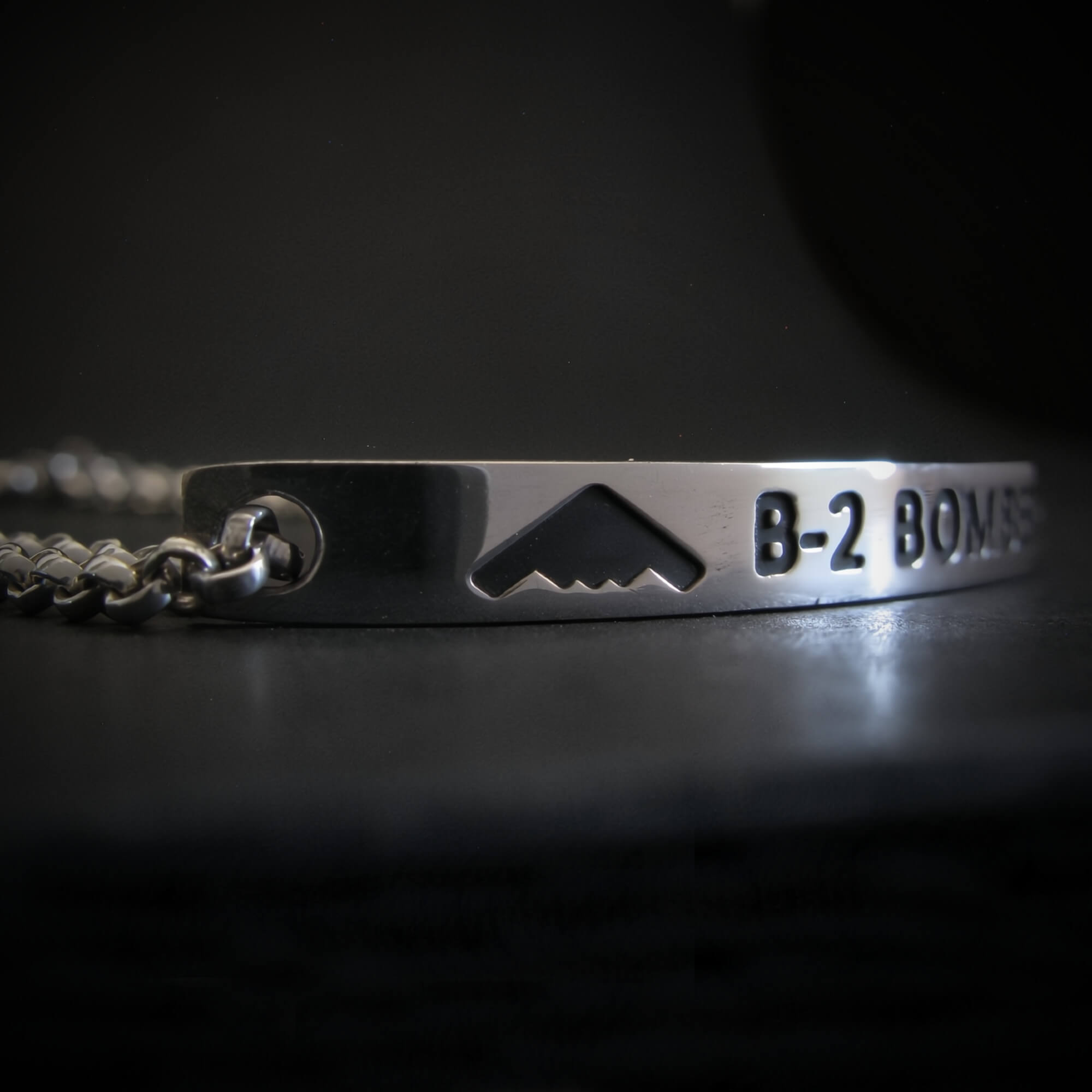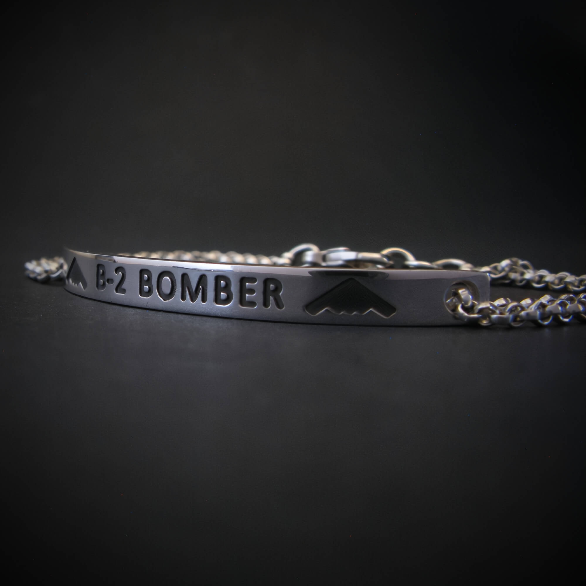 This B-2 Spirit Bomber bracelet brings the stealth and lets you take the lead. Whether you stick with the “B-2 BOMBER” text or swap it for a custom name, call sign, or date, the mission stays personal. Finished with iconic stealth silhouettes and a double chain, this one’s ready for formation flying or everyday wear.