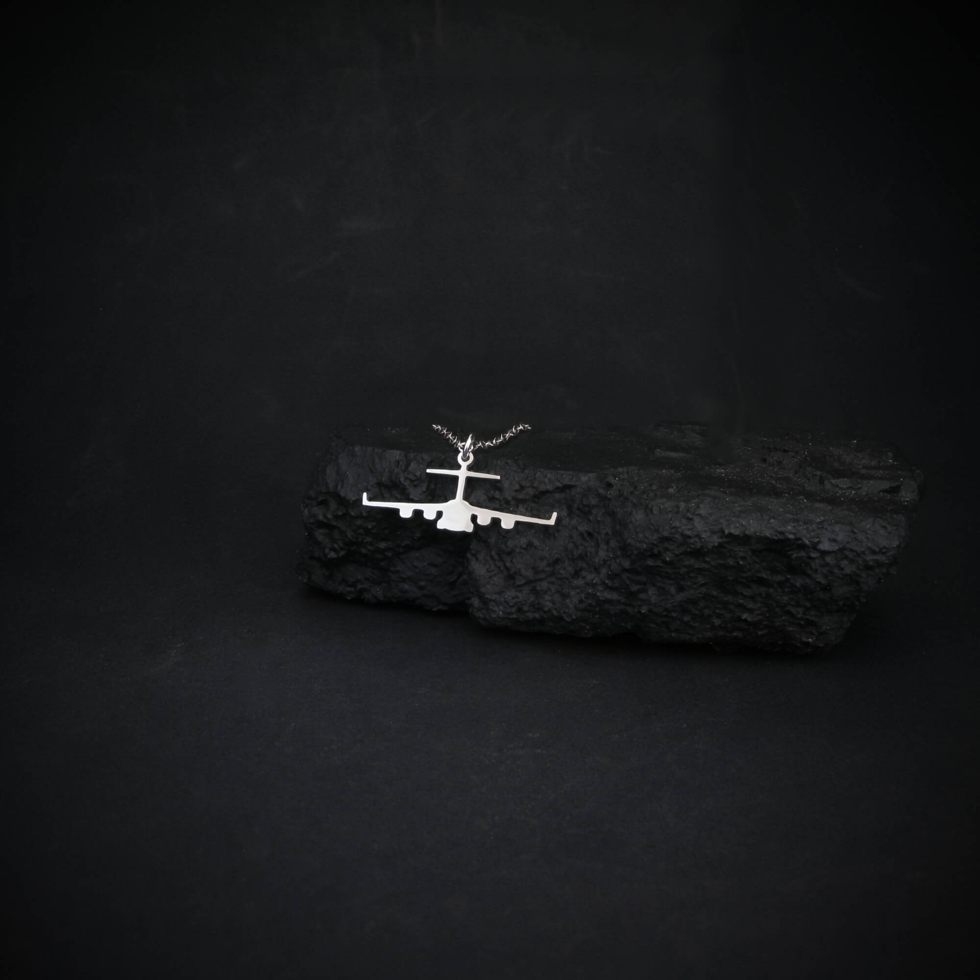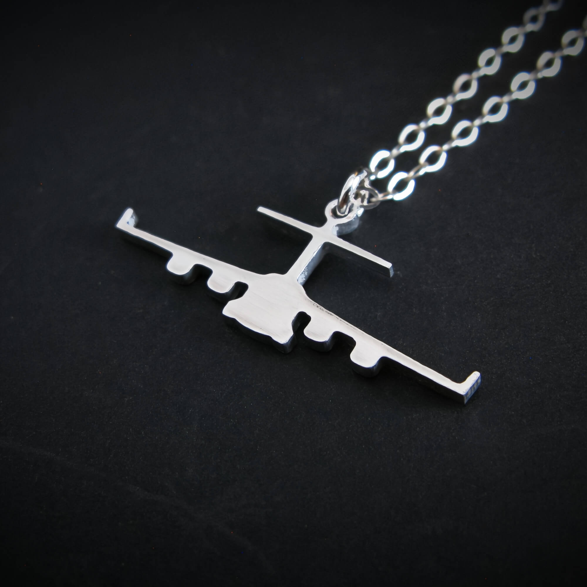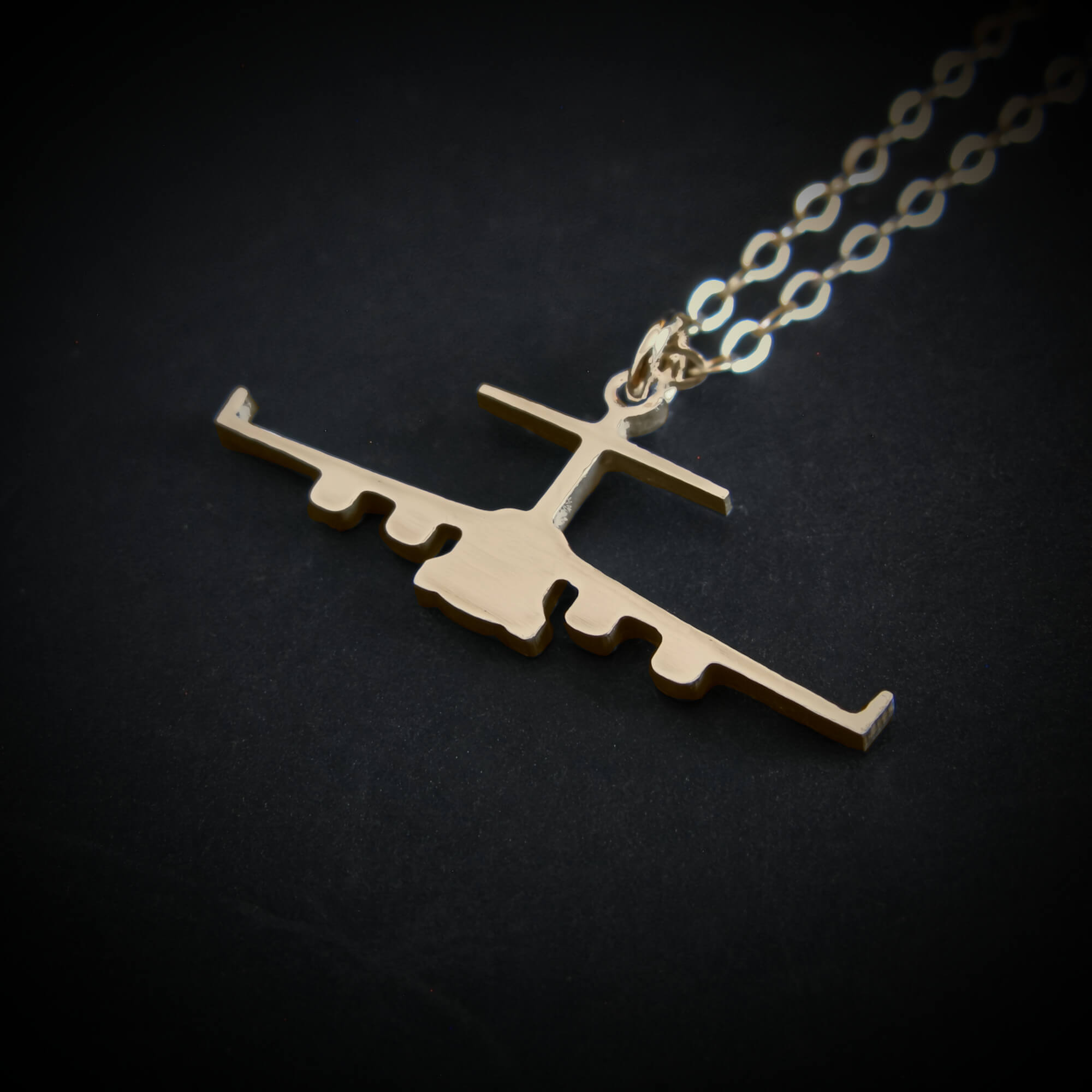 Handmade in Arizona in polished sterling silver or 14k gold, this front-view silhouette necklace captures the iconic wide stance and commanding presence of the C-17. From tarmac to takeoff, it’s a perfect tribute to Air Force might, cargo kings, and anyone who knows that heavylift means business.