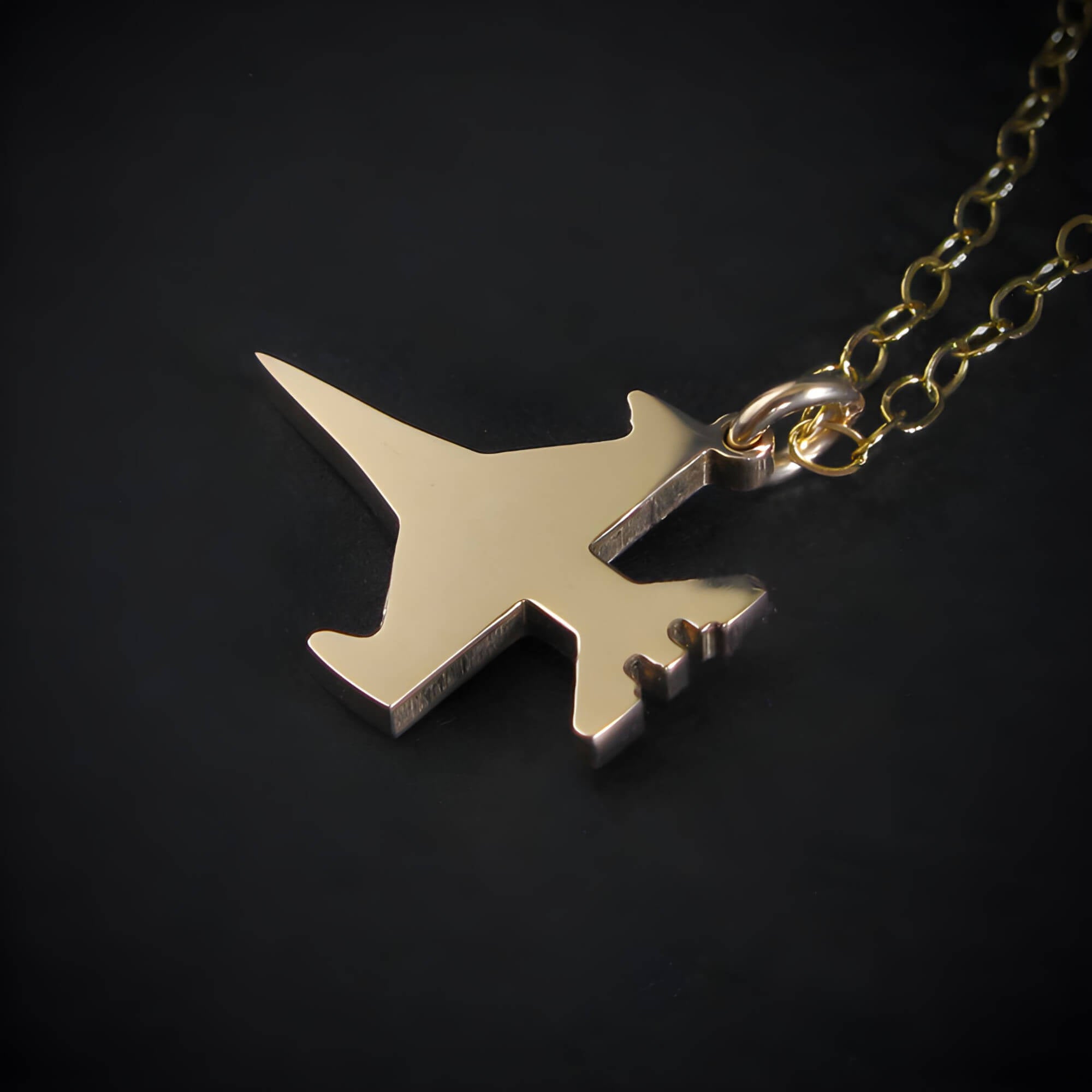 Celebrate speed, precision, and legendary multirole power with this artisan-crafted F-16 Fighting Falcon pendant necklace. Known to pilots as the “Viper,” this jet is a symbol of aerial dominance, and now you can wear its sleek silhouette in handcrafted sterling silver or 14k gold. Made in the USA with fine detail, this piece honors both the aircraft and those who fly it.