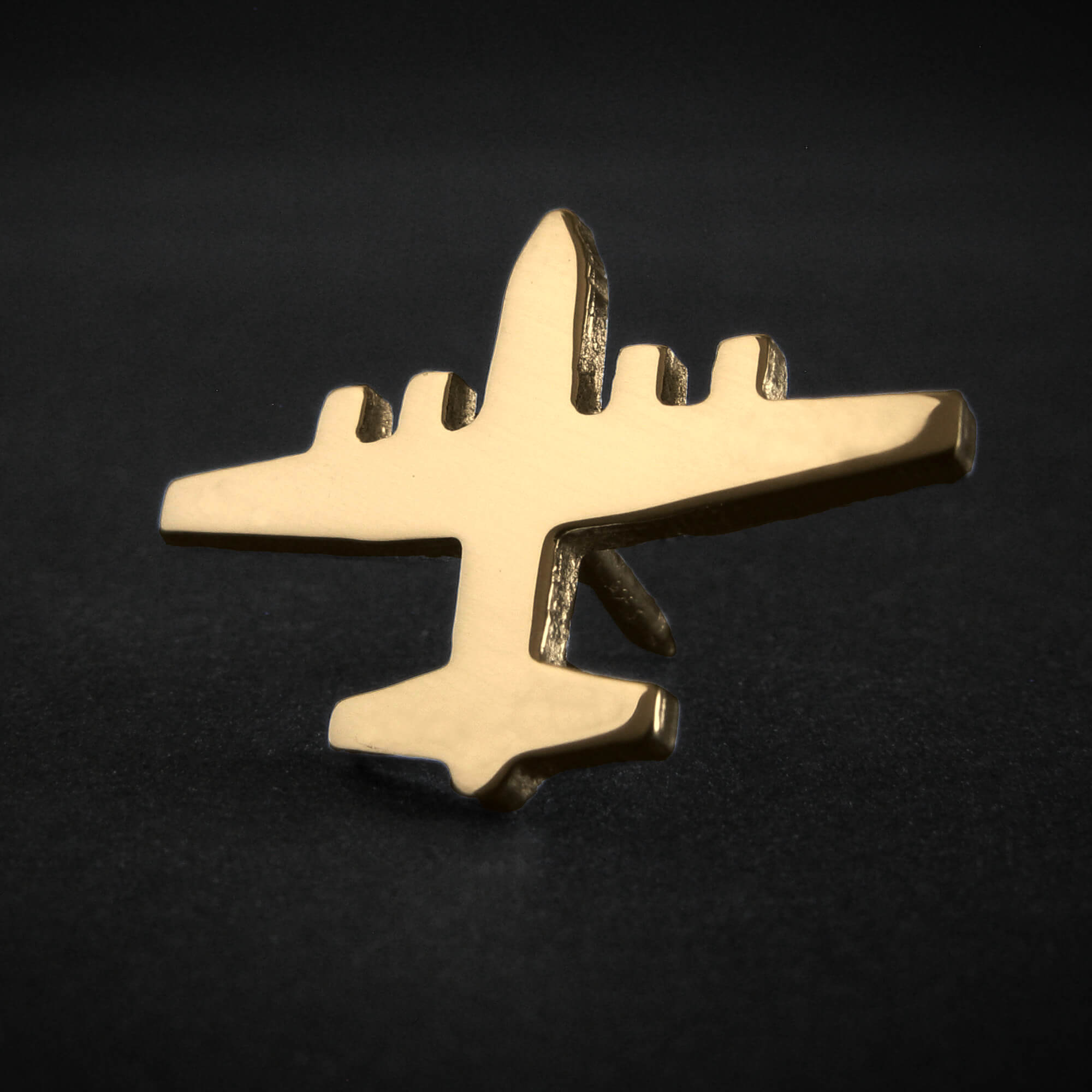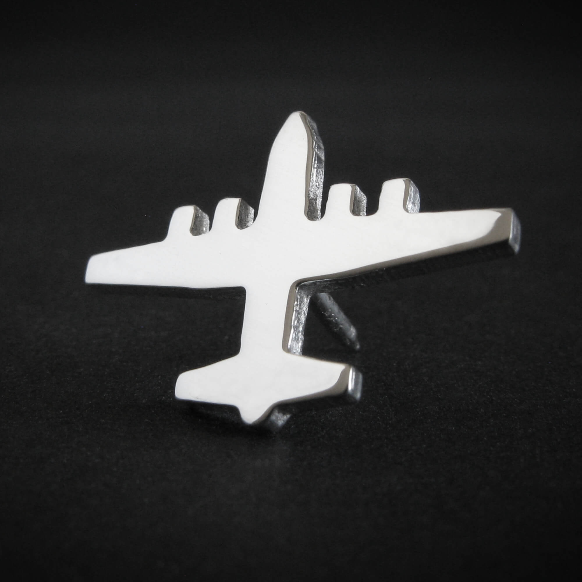 Honor the legendary C-130 Hercules with this artisan-crafted military aircraft tie tack. Meticulously handmade in the USA from your choice of sterling silver or 14k gold, this tie pin captures the silhouette of the iconic transport aircraft.